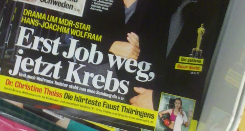 Wenn ich der erwähnte Hans-Joachim Wolfram wäre (und vorausgesetzt ich hätte Krebs und meinen Job verloren - keine Ahnung was an der Schlagzeile stimmt), wäre ich der SuperIllu für diese äußerst einfühlsame Schlagzeile sehr dankbar. Wenn man eine derartige Diagnose bekommt, ist das, was man am dringendsten benötigt, ein sensationsgeiler Provinz-Schmierfink, der eine "Erst Job weg, jetzt Krebs"-Schlagzeile hinrotzt und auch noch hämisch meine Tochter erwähnt, die nun "auch ohne Sendung dasteht". Vielleicht solltet ihr bei Bergdoktor-Schmonzetten bleiben, damit macht ihr wenigstens nichts kaputt.